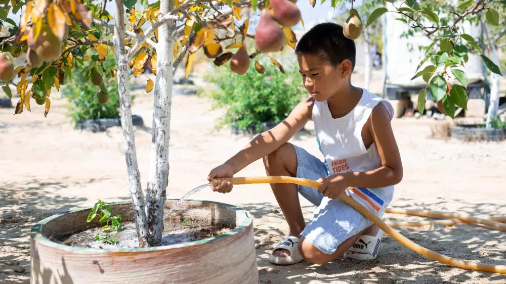 Одна из тех, кто получил доступ к питьевой воде через центральный колодец, Талшын Максуткызы. Сегодня она ухаживает за своим садом, и деревья начали давать плоды.