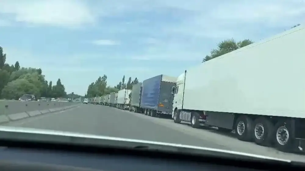В очереди стоит более 50 грузовиков, а затор растянулся на несколько километров.