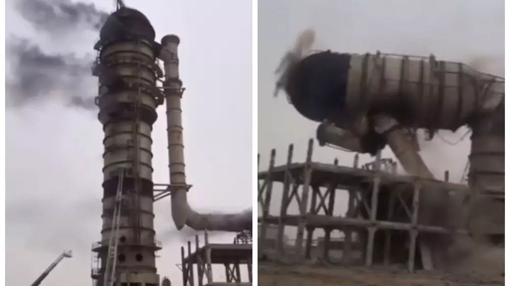 В производственной зоне города Актау в результате пожара рухнула 63-метровая башня, в которой хранились нефтехимические отходы. Видео случившегося опубликовали местные паблики, передает Tengrinews.kz.