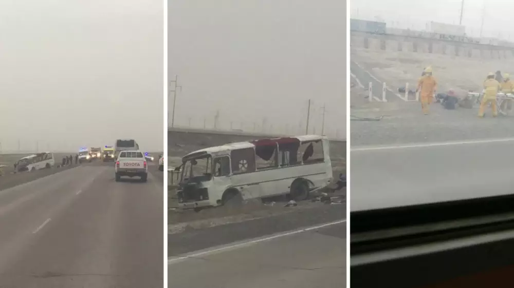 Авария произошла на автодороге в Жылыойском районе. Автобус принадлежал одной из подрядных компаний, работающей на месторождении Прорва. В момент аварии в нем находилось 11 работников компании. По предварительной версии, водитель автомашины КамАЗ совершал обгон и выехал на полосу встречного движения.