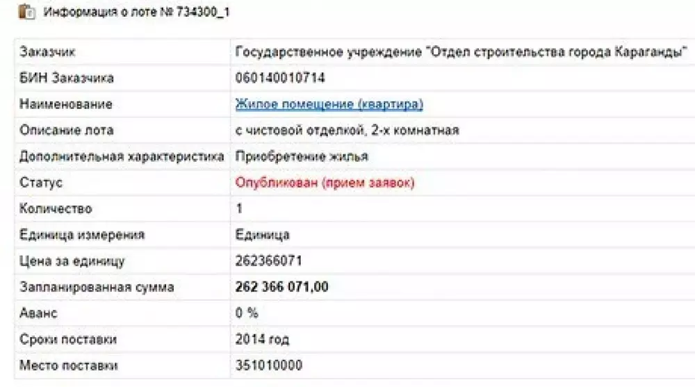 Акимат Караганды изменил название лота о приобретении квартиры за 262 миллиона тенге. Об этом корреспонденту Tengrinews.kz сообщили в пресс-службе ведомства. По словам представителей акимата Караганды, покупка двухкомнатной квартиры за такую сумму не планировалась. Изначально они собирались приобрести 3265 квадратных метров жилья по программе "Доступное жилье-2020" для молодых семей по цене около 90 тысяч тенге за квадратный метр. Квадратура была указана в технической спецификации, отмечают представители ведомства.