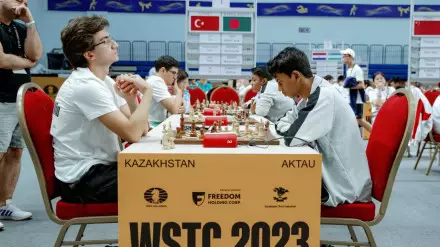 В Актау дан старт чемпионату мира по шахматам среди школьных команд: символический первый ход в категории до 18 лет сделал аким Мангистауской области Нурлан Ногаев, а на первой доске в категории до 12 лет ход выполнил Президент Казахстанской федерации шахмат Тимур Турлов.