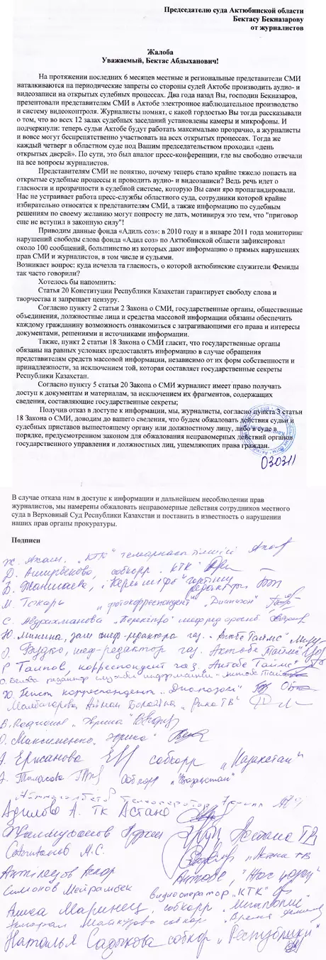 "По жалобе на данный момент ведется проверка, по ее результатам будет дан ответ", - сказал Кунтуов. По его словам, для проведения расследования создана специальная комиссия, в которую вошли судьи Актюбинского областного суда.