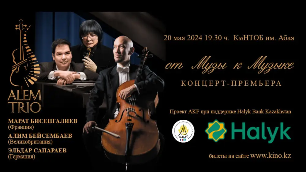 20 мая Ассоциация казахстанцев во Франции (AKF) и Halyk Bank представят всем алматинцам и гостям южной столицы эксклюзивный концерт "от Музы к Музыке" от классического Alem Trio. Это событие обещает стать одним из самых запоминающихся в этом году.