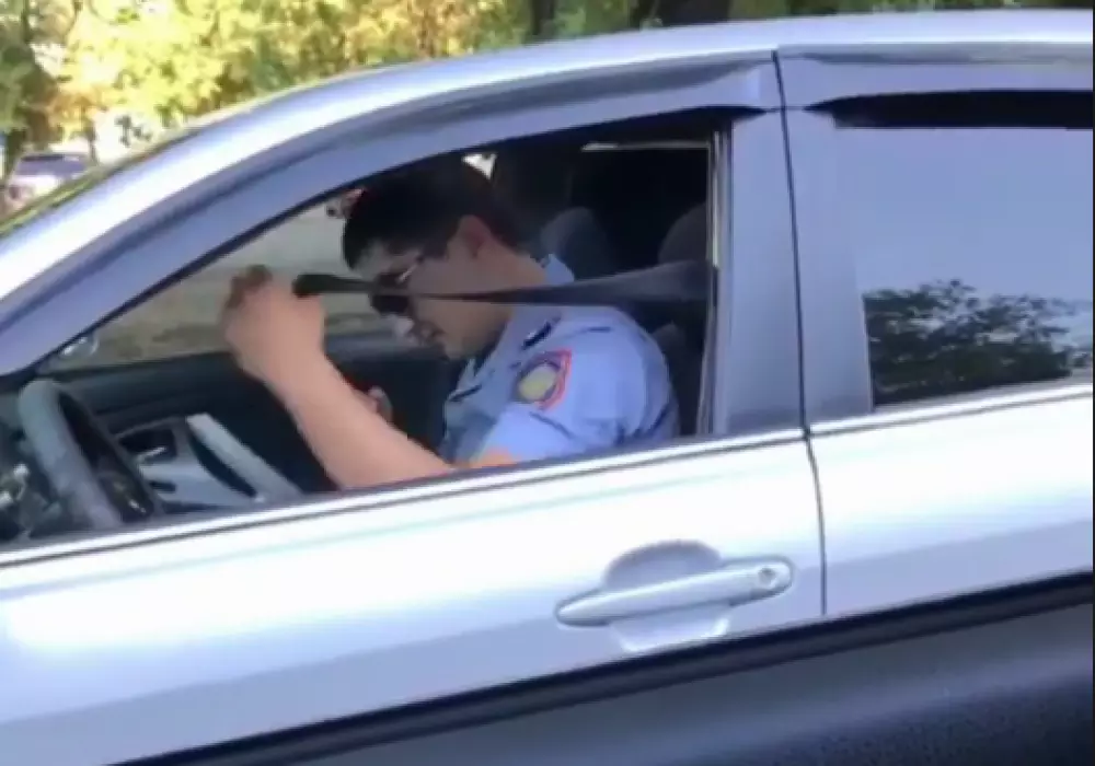 Алматинец заставил человека в полицейской форме пристегнуться за рулем Кадр из видео