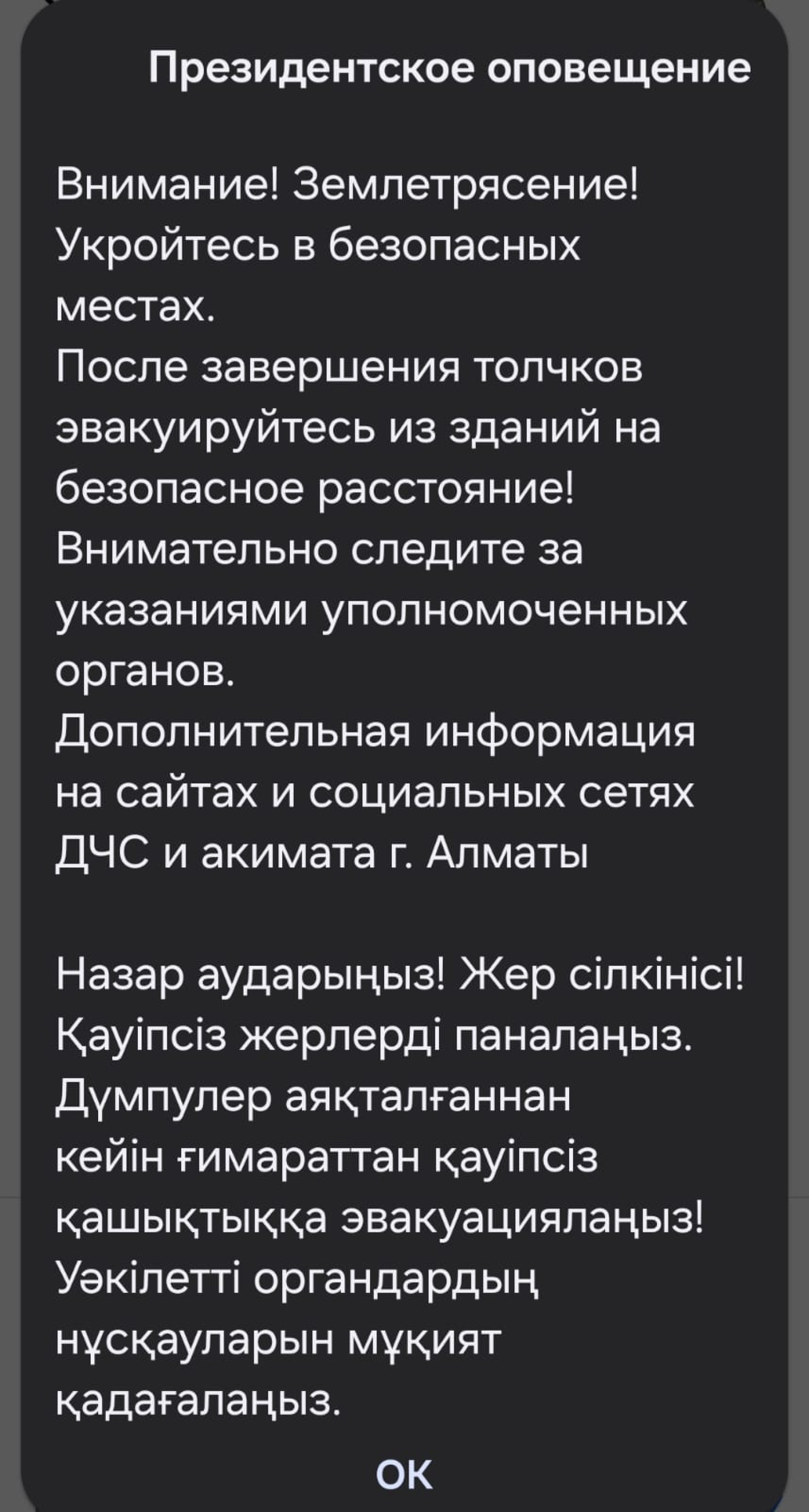 Алматинцам на мобильные телефоны стали приходить оповещения о землетрясении, передаёт корреспондент Tengrinews.kz.