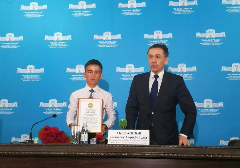 В свою очередь ученик 11 класса Тимурбек Жамаладдинов также поблагодарил учителей, министра и акима Алматинской области, который выделил отважному школьнику грант на обучение в вузе.