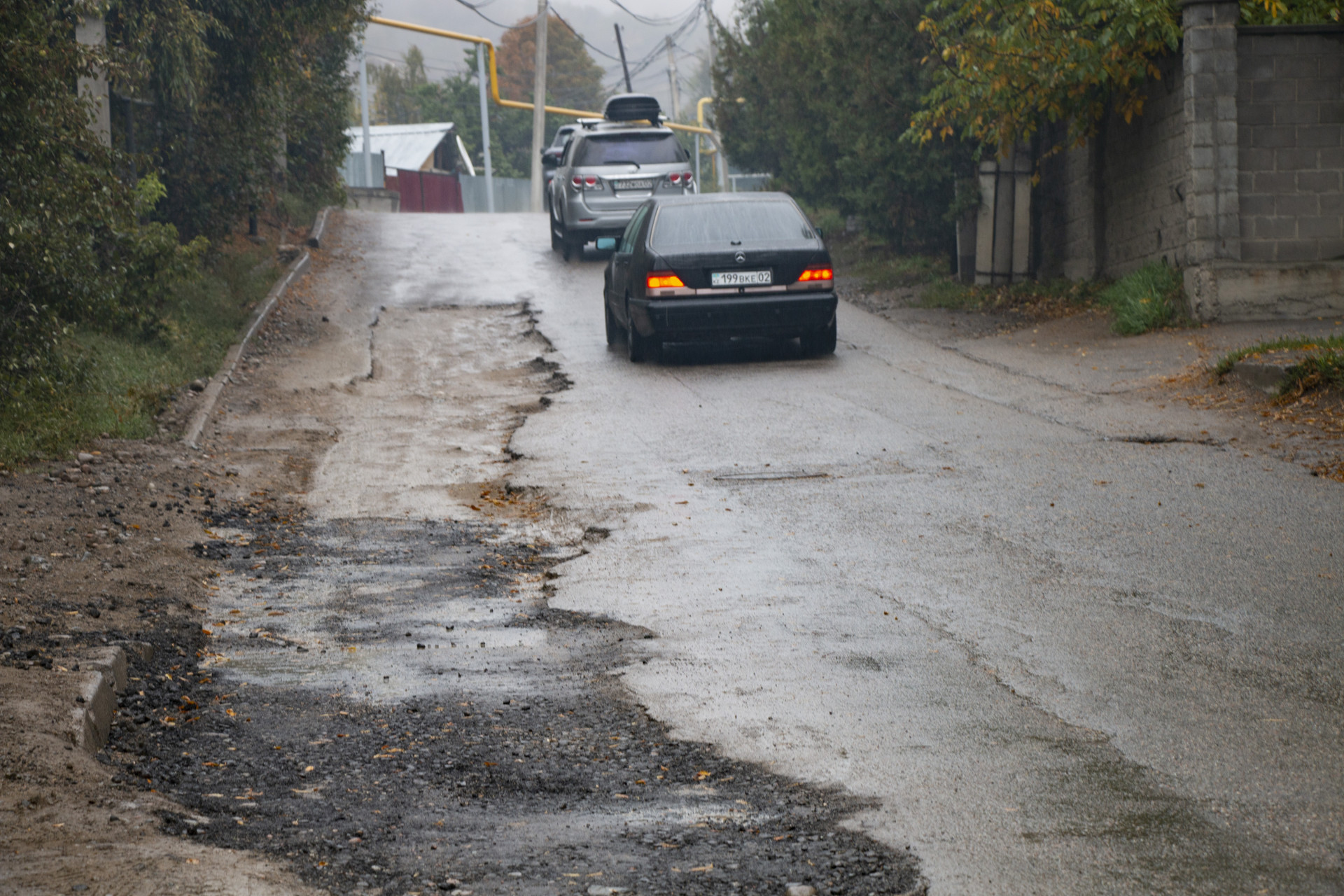 Если подниматься по Ушкемпирова, то можно заметить, что большую часть выкопанной траншеи уже залатали. Однако проблемы на дороге начинаются ближе к жилым комплексам Silver Hills и Remizovka, там, где улица Ушкемпирова плавно перетекает в улицу Айралы. Здесь до сих пор остаются участки дороги без асфальта.