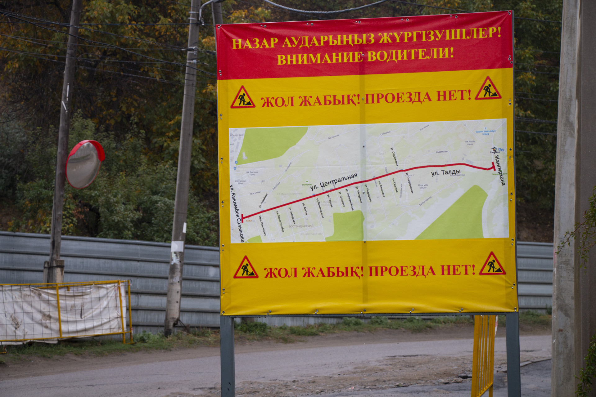На улице Талды, судя по виду, траншею засыпали не так давно. Здесь всё ещё есть знаки о перекрытии дороги.