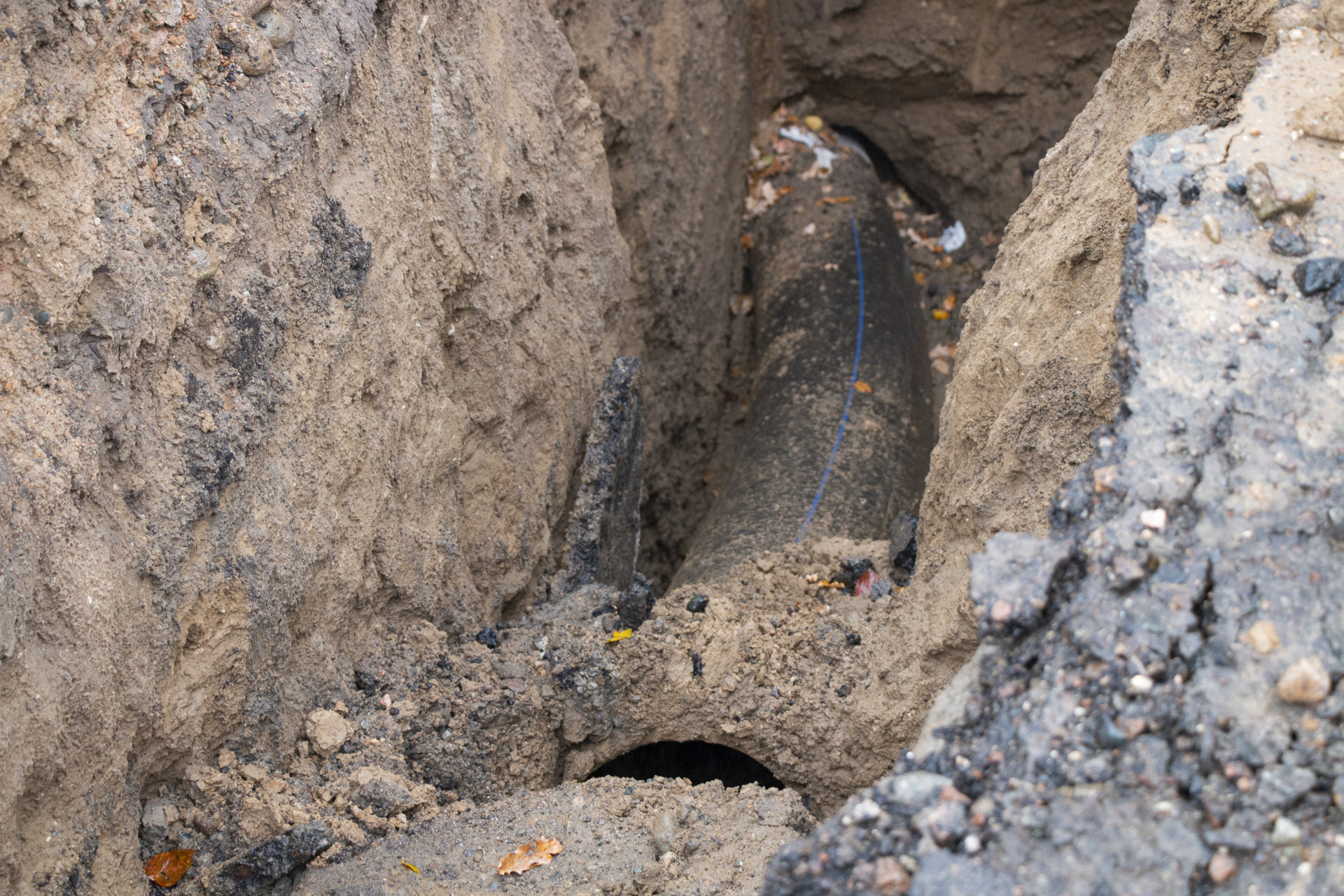 Траншея для прокладки труб местами уже заделана асфальтом, а местами всё ещё становится источником проблем для автомобилистов.