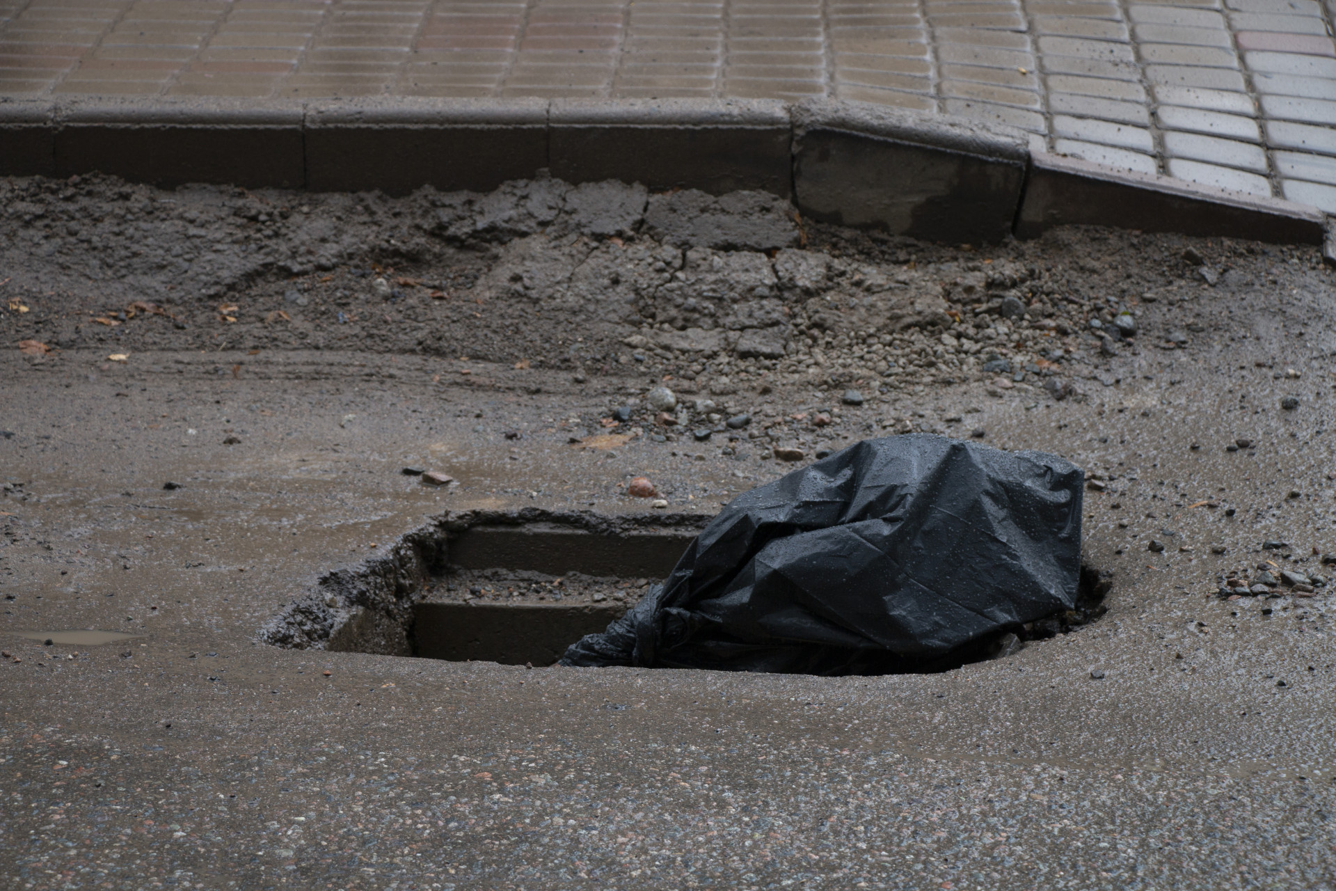 Ямы, траншеи и чёрный пакет, торчащий из ливнёвки, вместо предупредительного знака.