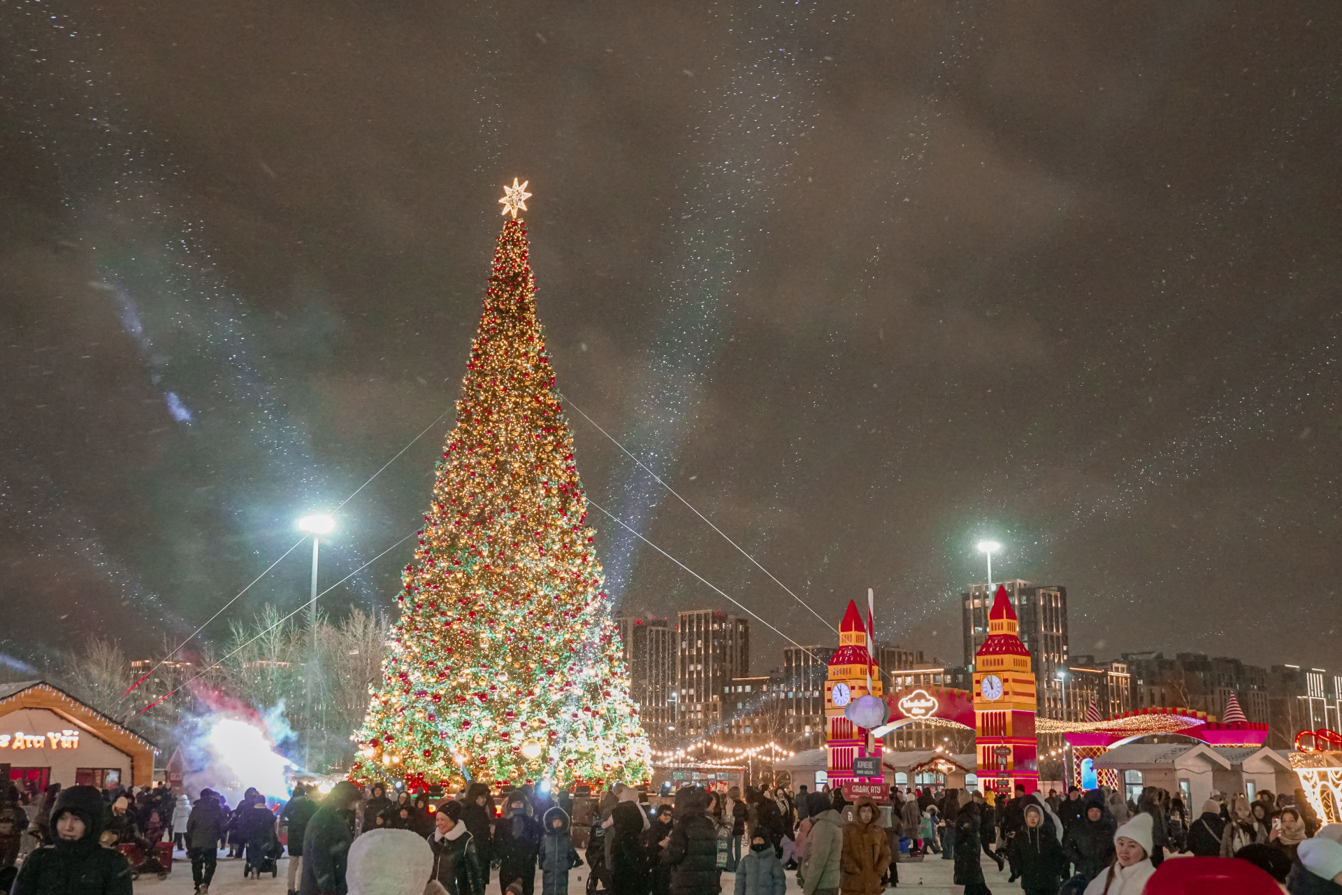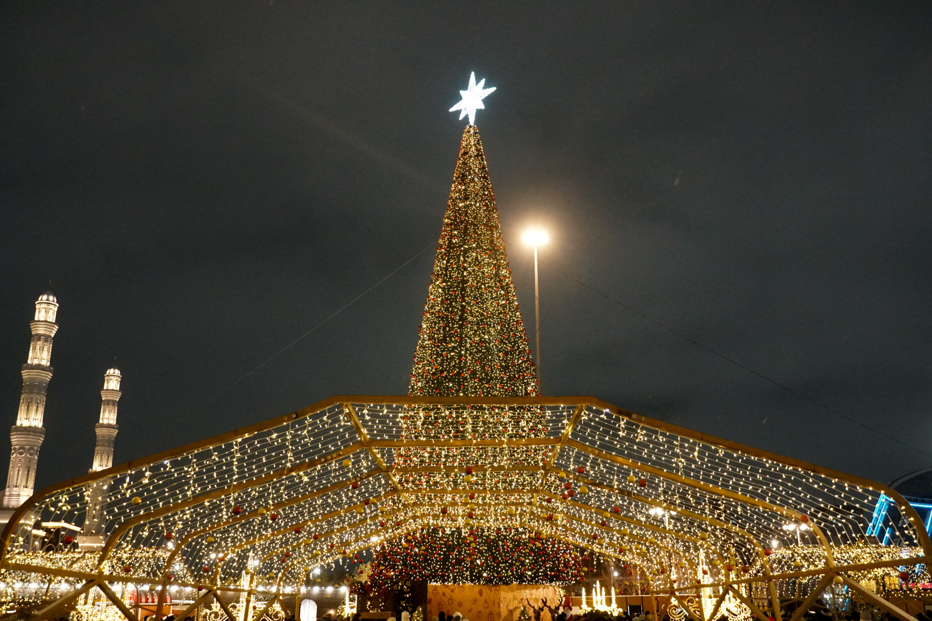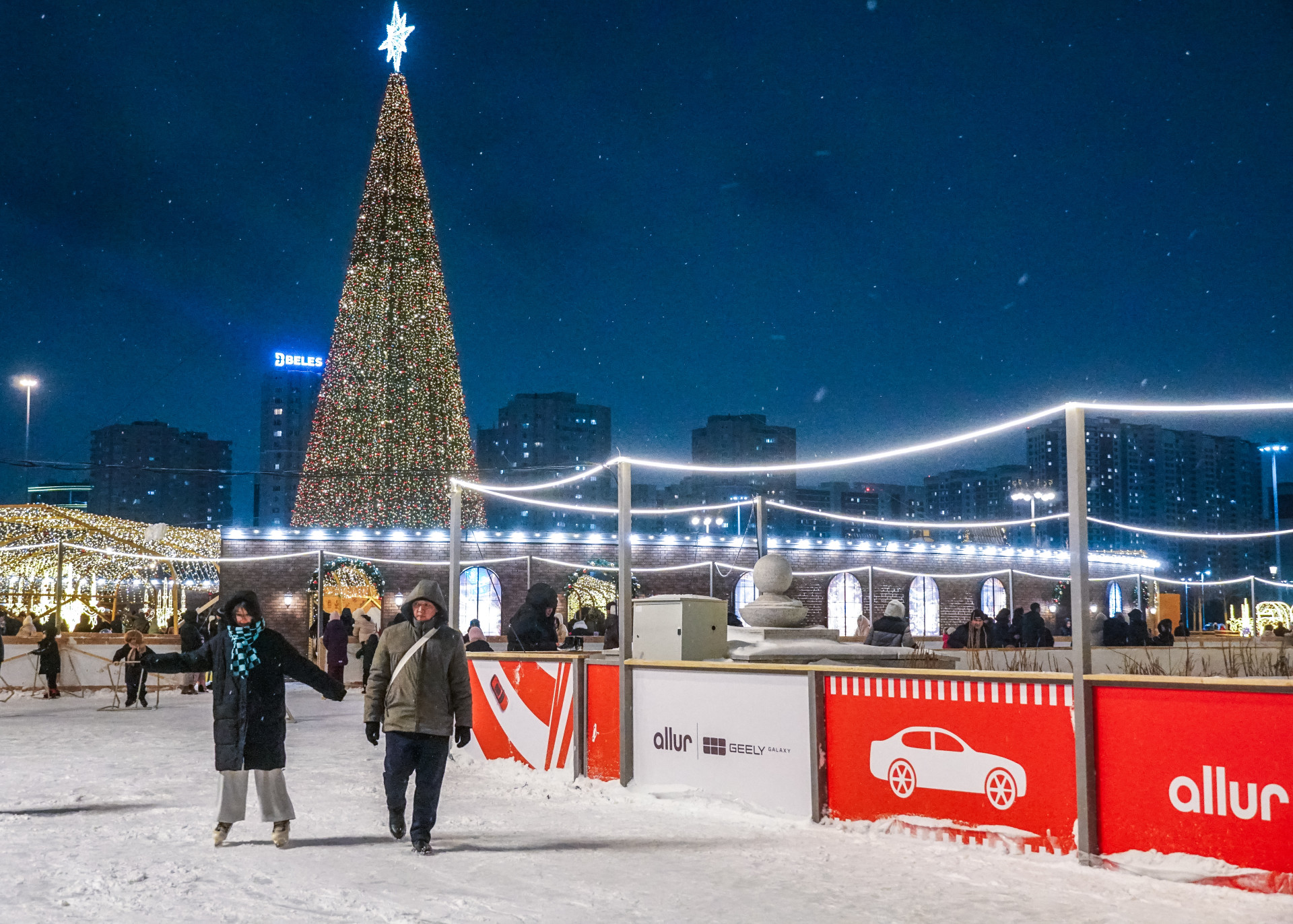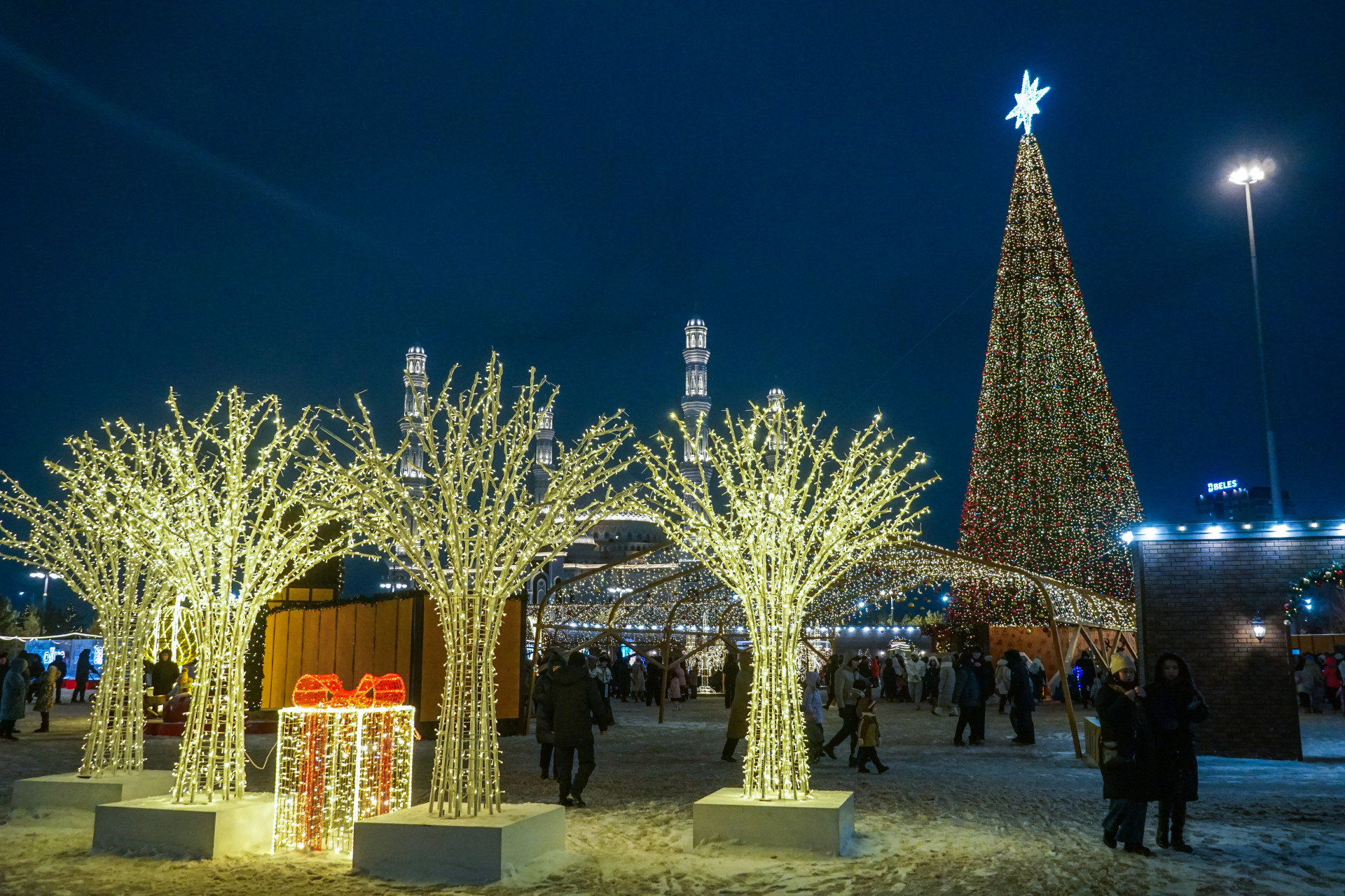 Праздничные мероприятия охватили всю столицу. В районе Нура новогодние ёлки зажглись сразу на 11 локациях. Центральной точкой стала парковка у стадиона "Астана Арена", где установили 25-метровую ёлку.