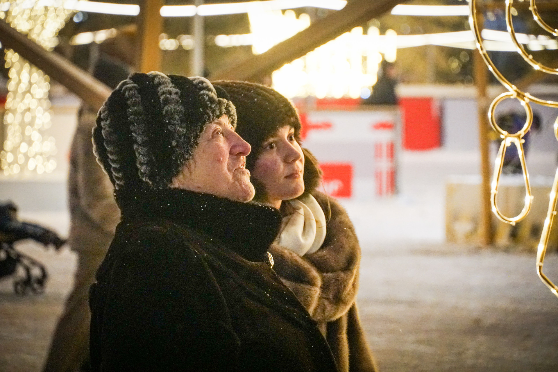 Ровно в 18:00 ведущие объявили обратный отсчет. Люди подняли телефоны, дети начали считать вслух. И в тот же миг ёлка на площади вспыхнула огнями.