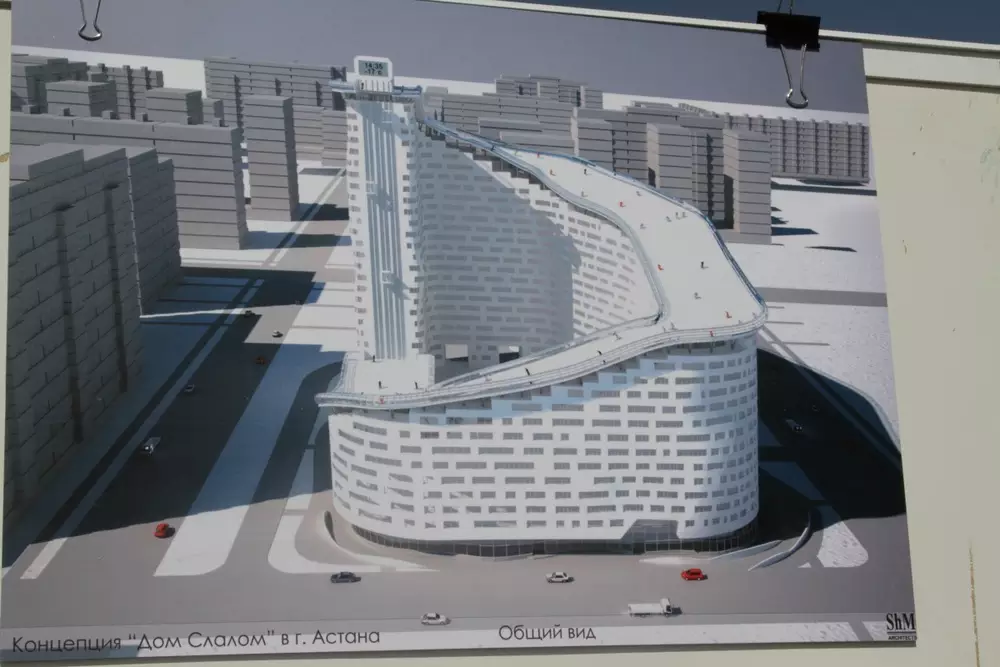 Автор этого проекта, архитектор Шохан Матайбеков, говорит, что строительство, как он называет его - "дома-слалома" обойдется дешевле, чем строительство обыкновенной горно-лыжной трассы.