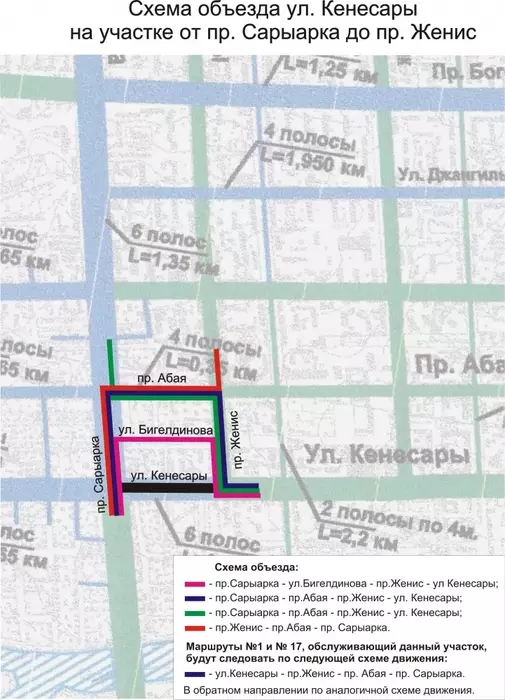 В направлении с левого берега реки Есиль по проспекту Сарыарка - улица Бигелдинова - проспект Женис - улица Кенесары; проспект Сарыарка - проспект Абая - проспект Женис - улица Кенесары. В направлении с проспекта Богенбай батыра рекомендуют объезжать по проспекту Абая - проспект Женис - улица Кенесары. В направлении левого берега реки Есиль по проспекту Женис - проспект Абая - проспект Сарыарка. По улице Кенесары в сторону проспекта Сарыарка по улице Кенесары - проспект Женис - проспект Абая - проспект Сарыарка.