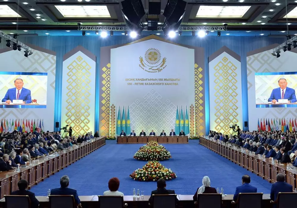 Нурсултан Назарбаев, открывая торжественную часть собрания, поздравил всех казахстанцев с 550-летием Казахского ханства. В Астану на это мероприятие приглашены президенты Кыргызстана и Азербайджана. В числе приглашенных также представители администрации президента Туркменистана. Зал Дворца Независимости собрал депутатов Парламента, госслужащих, творческую интеллигенцию, деятелей культуры, искусства и спорта, а также представителей СМИ.