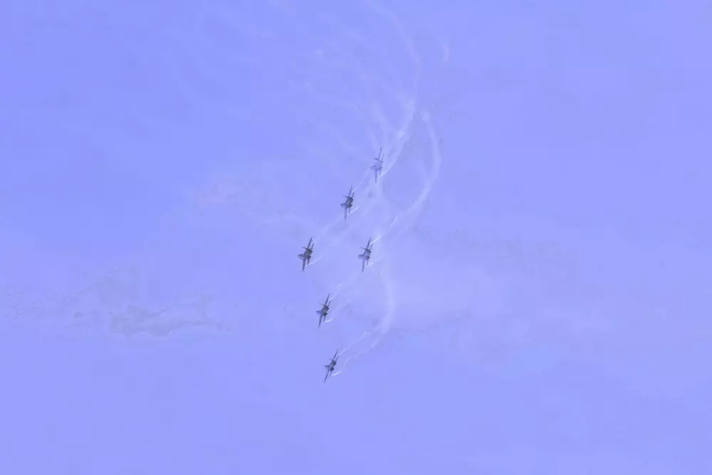 "Группа "Жетысу" будет показывать фигуры высшего пилотажа на самолетах Су-27, среди которых "петля Нестерова" и роспуск "Байтерек", - сообщил главнокомандующий силами воздушной обороны Министерства обороны Казахстана, генерал-майор Нурлан Орманбетов в ходе генеральной репетиции военного парада.