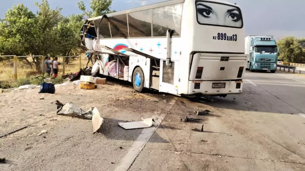 Авария произошла 7 августа примерно в 18:00 на 720-м километре трассы республиканского значения Алматы - Ташкент - Термез. Автобус Van Hool, у которого взорвалось правое колесо, сбил металлическое ограждение, разделяющее две стороны автодороги, после чего врезался в прицеп грузовой автомашины МАN, двигавшейся по своей полосе во встречном направлении.