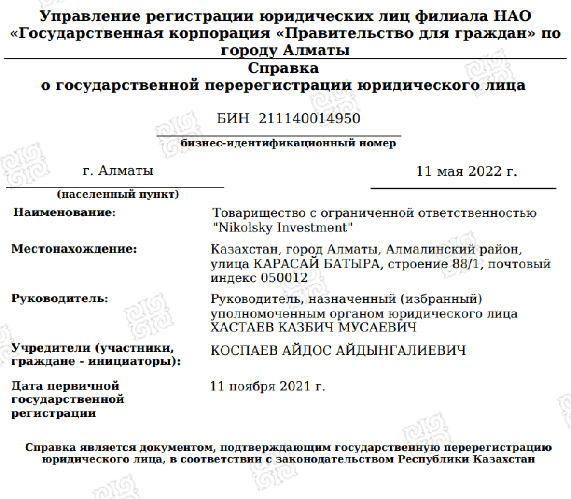 "В споре между двумя юридическими лицами учредители стороной процесса являться не могут, поскольку свои права они реализуют через действия исполнительного органа, директором ТОО Nikolsky Investment со дня его открытия является Х. К. Изучив доводы апелляционной жалобы, с учетом приведенных обстоятельств дела суд приходит к выводу о возврате апелляционной жалобы Коспаева А. А.", – говорится в тексте документа.