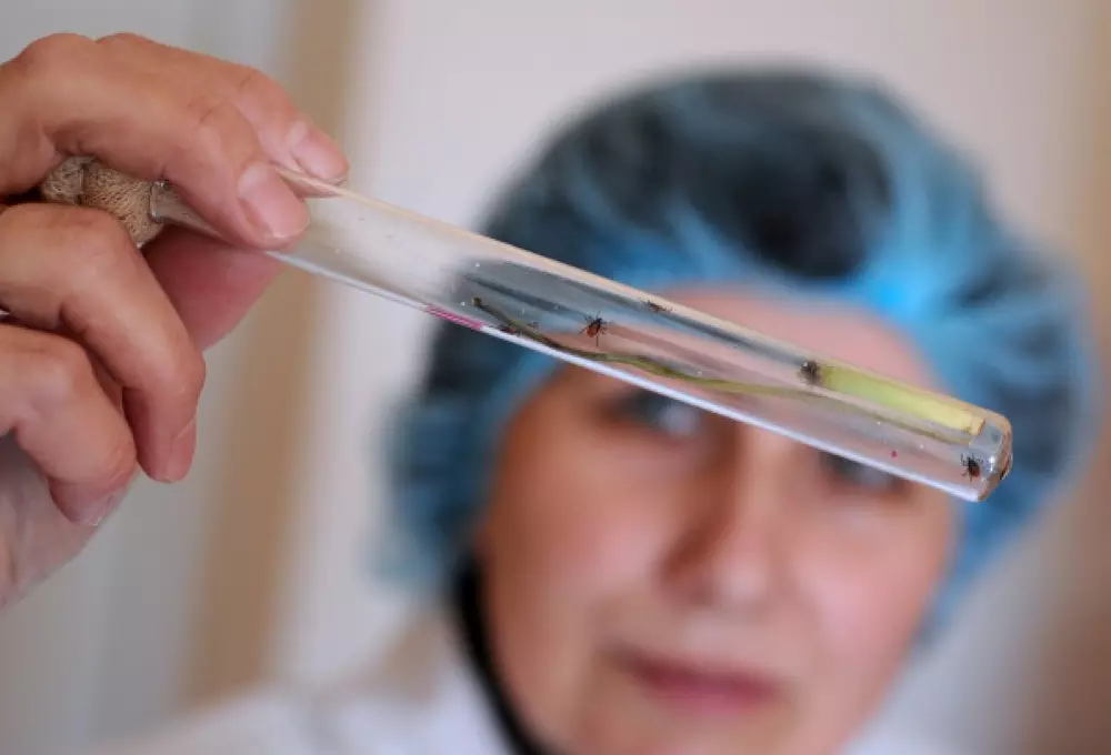 Более 30 алматинцев пострадали от укусов клещей Сотрудница паразитологической лаборатории держит колбу с клещами. ©РИА Новости