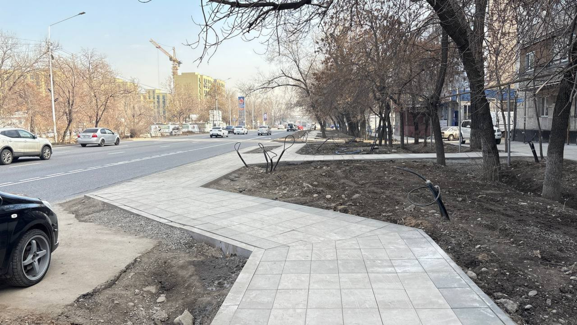 Проект BRT на проспекте Райымбека реализуют по принципу «от фасада до фасада». На обеих сторонах улицы уже видны новые бордюры и уложенная брусчатка. При этом участки газона пока остаются неухоженными, а кабели для будущего освещения всё ещё находятся на поверхности.