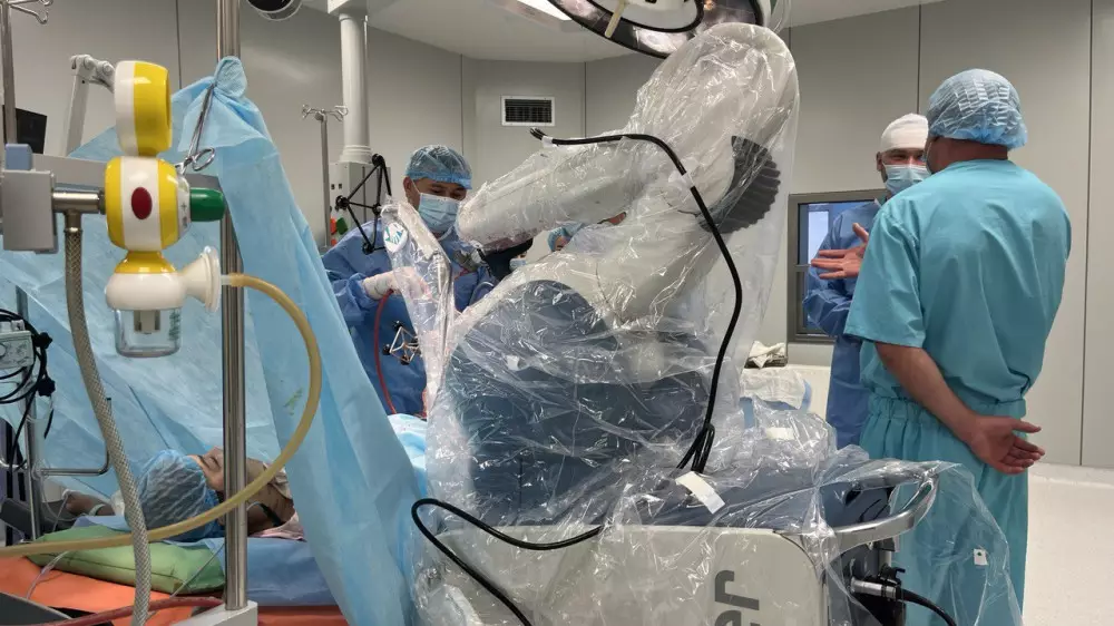 Когда я зашла в операционный зал, в залитой светом комнате команда врачей уже приступила к операции. Над операционным столом склонились врач травматолог-ортопед, кандидат медицинских наук Кайрат Ашимов, руководитель Республиканского центра эндопротезирования суставов, врач травматолог-ортопед, кандидат медицинских наук Алексей Белокобылов, российский врач травматолог-ортопед Алексей Шумский и уникальный робот-ассистент.