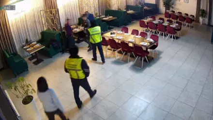 На кадрах видно, как четверо мужчин сидят в кафе, выпивают, неожиданно один из них встает и кидает на пол кружку с пивом, а затем и бутылку из-под минералки.