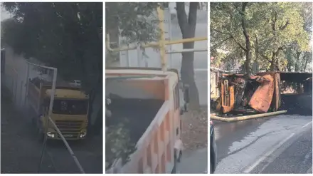 В сети распространилось видео с места ДТП. На кадрах видно, как грузовик проносится по тротуару в непосредственной близости от газовой трубы, а затем она падает.