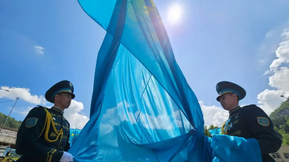 Высота флагштока на площадке высокогорного спортивного комплекса "Медеу" составляет 40 метров. Размер поднятого флага Казахстана – 14 на 7 метров.