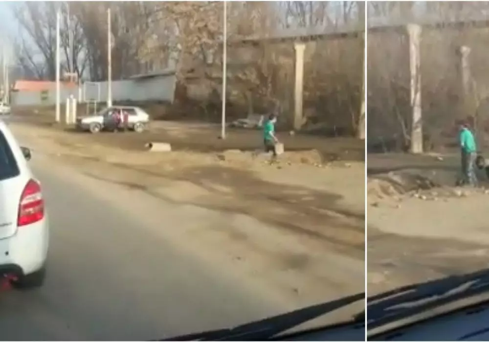 Местный житель и автор видео Булат Сахарбеков рассказал, что из-за образовавшихся ям на трассе практически каждый день образовываются автомобильные заторы. Водители проезжают данный участок дороги, который должен занимать 5-10 минут, за полтора-два часа. Оказалось, что недавно строители прокопали здесь траншею для установки труб, после чего на дороге остались ямы. Засыпать их вызвались местные мальчишки, которые лопатами начали засыпать ямы грунтом.
