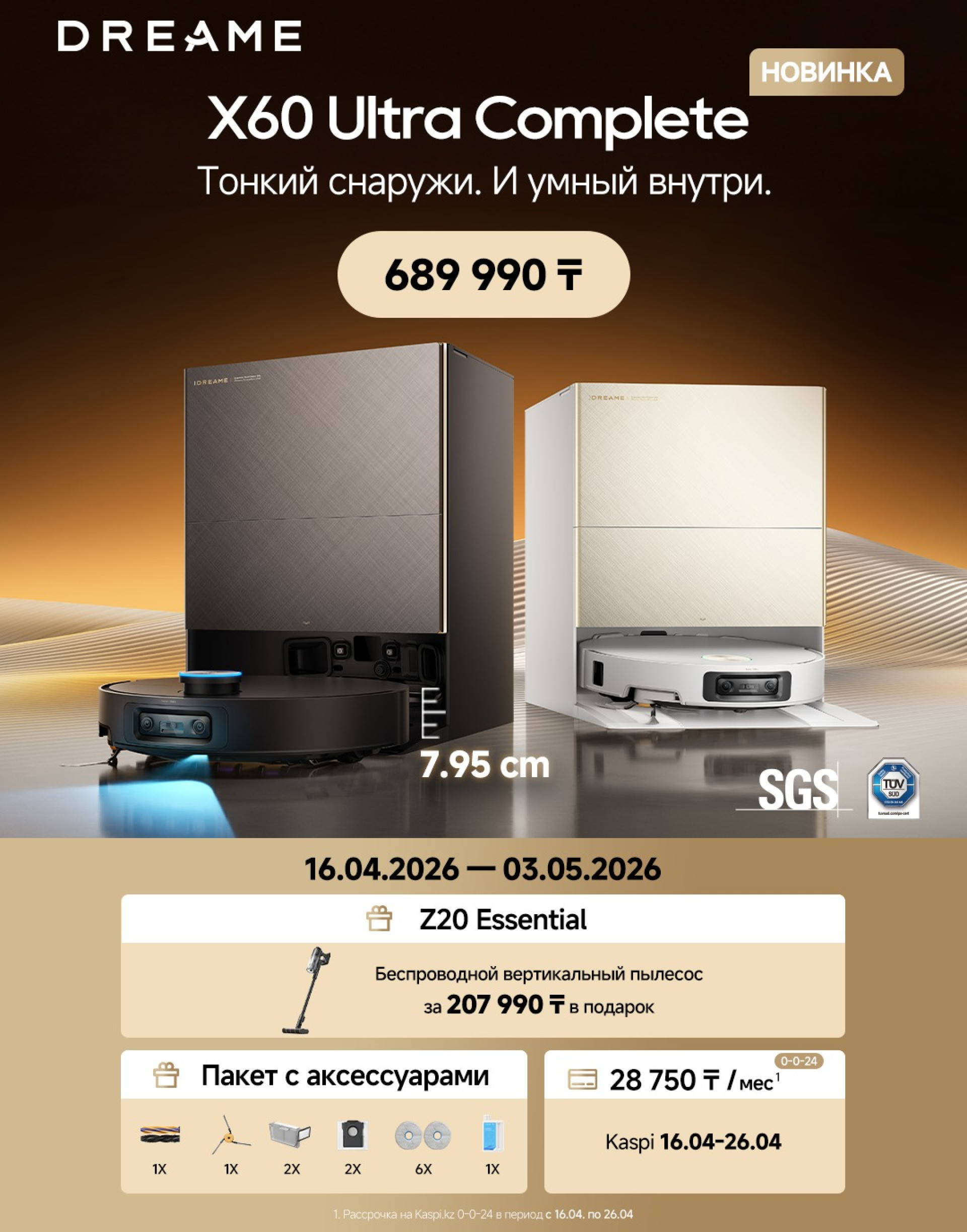 - X60 Ultra Complete (689 990 тенге) — в подарок вертикальный пылесос Z20 Essential (выгода до 207 990 тенге)