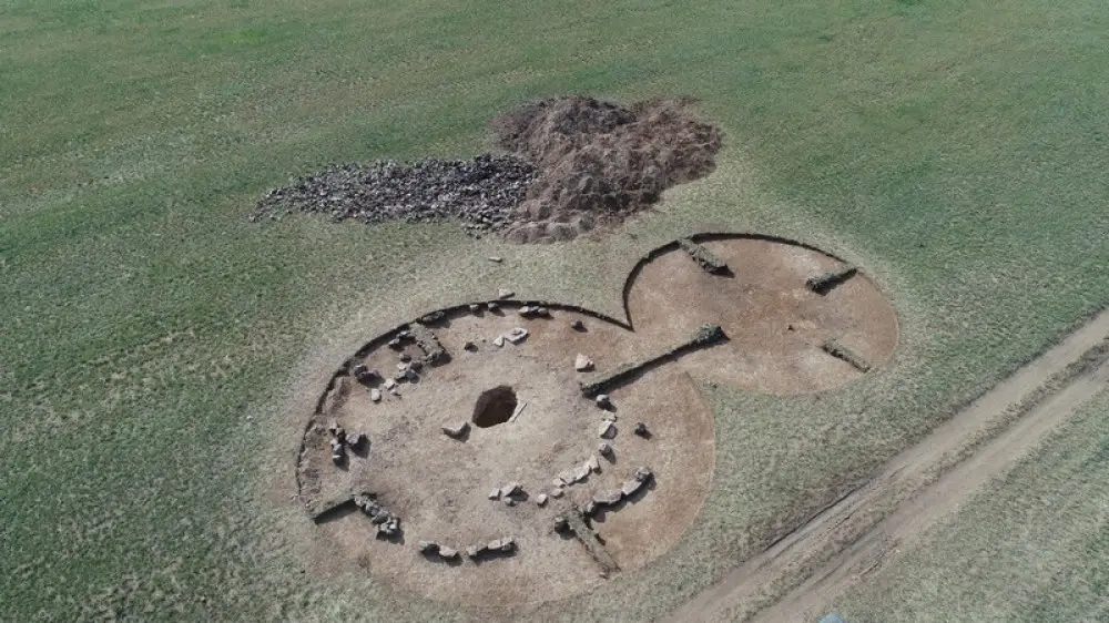 Археологи продолжают изучать на могильнике Аккезен курган с усами. Это сооружение состоит из головного кургана и двух курганов-спутников, от которых отходят на восток две дугообразные каменные выкладки. Заканчиваются они небольшими каменными насыпями.