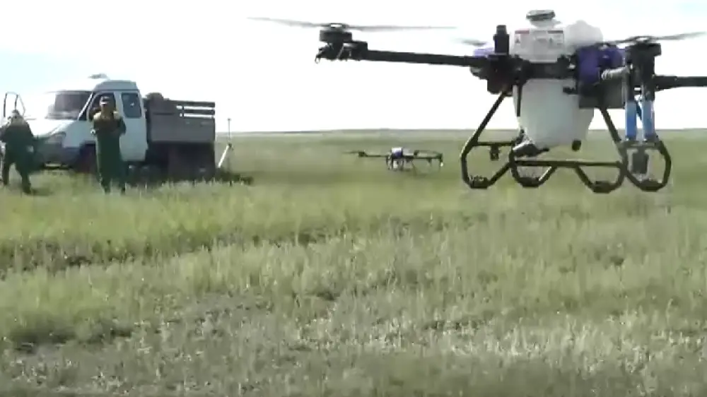 Дроны впервые применяют против саранчи в Западно-Казахстанской области Кадры из видео