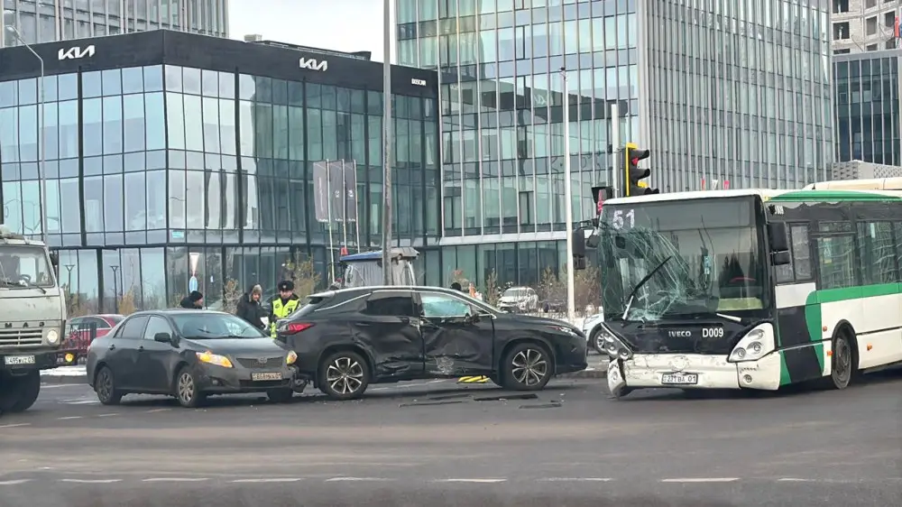 В департаменте полиции столицы сообщили, что на пересечении проспекта Мангилик Ел и улицы Хусейна бен Талала водитель автомобиля Lexus, выполняя левый поворот, не уступил дорогу транспортному потоку, движущемуся навстречу. В результате произошло столкновение с общественным транспортом и легковым автомобилем Toyota Corolla.