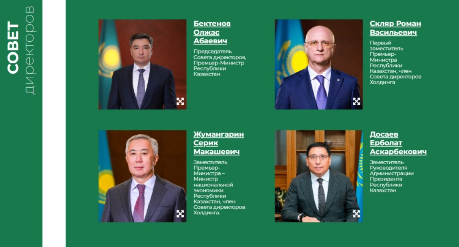 Совет директоров возглавил премьер-министр Олжас Бектенов. В его состав также вошли первый вице-премьер Роман Скляр, министр экономики Серик Жумангарин, Ерболат Досаев, министр финансов Мади Такиев, а также министр промышленности и строительства Ерсайын Нагаспаев.