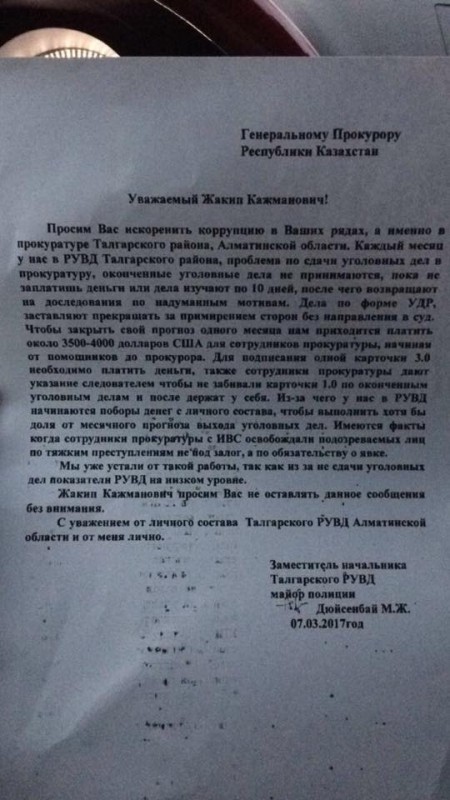 "Это фейк! Генпрокуратура провела проверку по данному факту. Заместитель начальника Талгарского РУВД Дюсенбай М. пояснил, что такого обращения никогда не писал, факты, изложенные в нем, не соответствуют действительности, подпись в обращении ему не принадлежит, более того в фамилии допущена ошибка. Также он пояснил, что с 15 февраля этого года находится на больничном. Несмотря на это, Генпрокуратурой начата проверка, в том числе проводится опрос сотрудников прокуратуры и РУВД Талгарского района", - заявил Нурдильда Ораз.