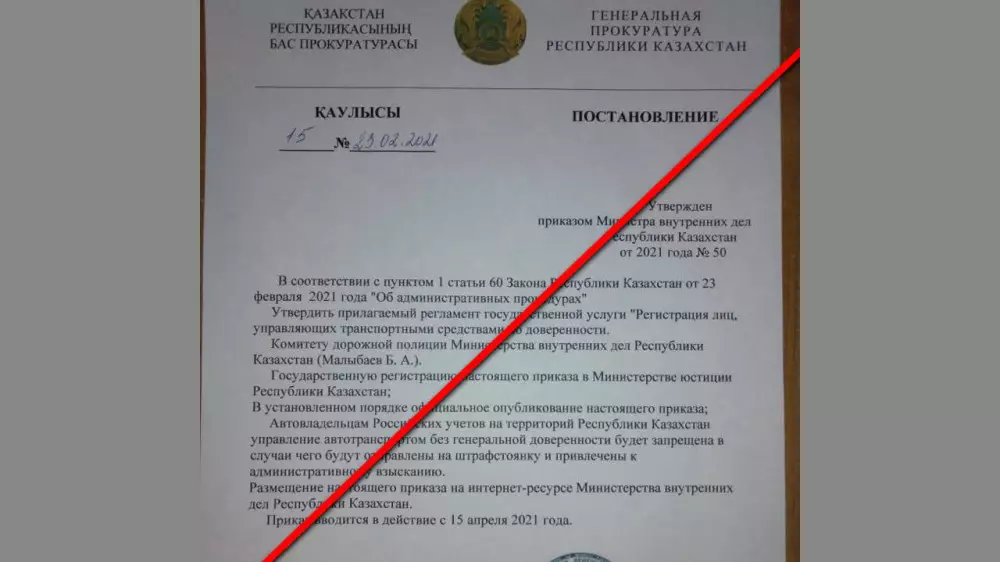 В документе говорится, что якобы владельцам машин, поставленных на учет в России, запрещается ездить без генеральной доверенности на территории Казахстана. В пресс-службе Генпрокуратуры опровергли этот фейк.