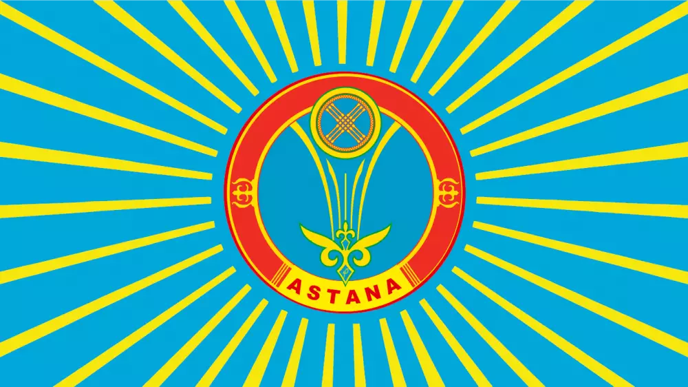 Также планируется установить, что флаг Астаны представляет собой прямоугольное полотнище голубого цвета с отношением ширины к длине 1:2 с размещением в середине герба города Астаны, от которого во все стороны отходят лучи солнца золотистого цвета.