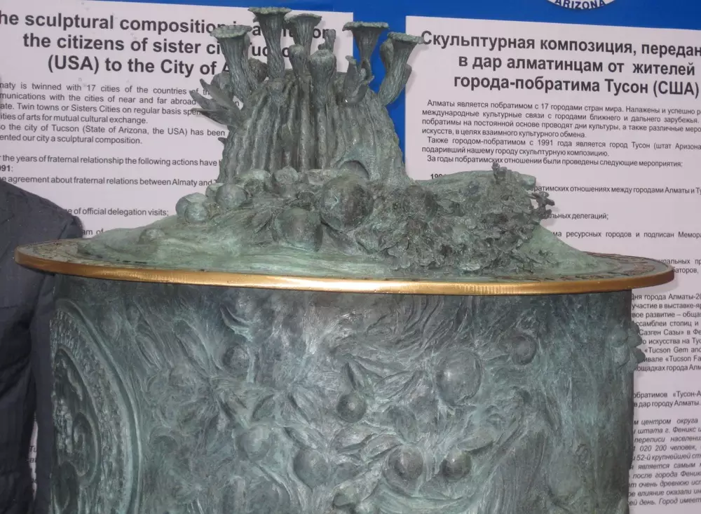 Жители американского города Тусон (штат Аризона) подарили алматинцам скульптуру, символизирующую тесные взаимоотношения между городами-побратимами, передает корреспондент Tengrinews.kz. Памятник представляет собой бронзовую чашу, в которую помещены символы Аризоны и Алматы - кактус и яблоко. Скульптура была изготовлена на деньги жителей Тусона и подарена алматинцам в знак дружбы между городами, которая зародились более 20 лет назад. Автором памятника - американский художник Марк Росси. Открытие памятника прошло в парке на горе Кок-Тобе. На церемонии присутствовали аким Алматы Ахметжан Есимов, временный поверенный по делам США в Казахстане Джон Ордвей и представители официальной делегации из Тусона во главе с председателем комитета городов-побратимов "Тусон-Алматы" Джэри Гэри. Есимов сообщил о том, что он попросил городских архитекторов подготовить жителям Тусона достойный ответный подарок. Джон Ордвей отметил, что в отношениях между странами, помимо экономики и политики, самым главным является отношение между людьми. Свою речь он закончил по-казахски: "Мереке кутты болсын! Рахмет!". На церемонии Есимову было торжественно вручено письмо от мэра Тусона Роберта Уокапа, в котором тот рассказал о своих впечатлениях во время посещения Алматы, отметив, что визит стал для него "одним из самых ярких и запоминающихся моментов в жизни".
