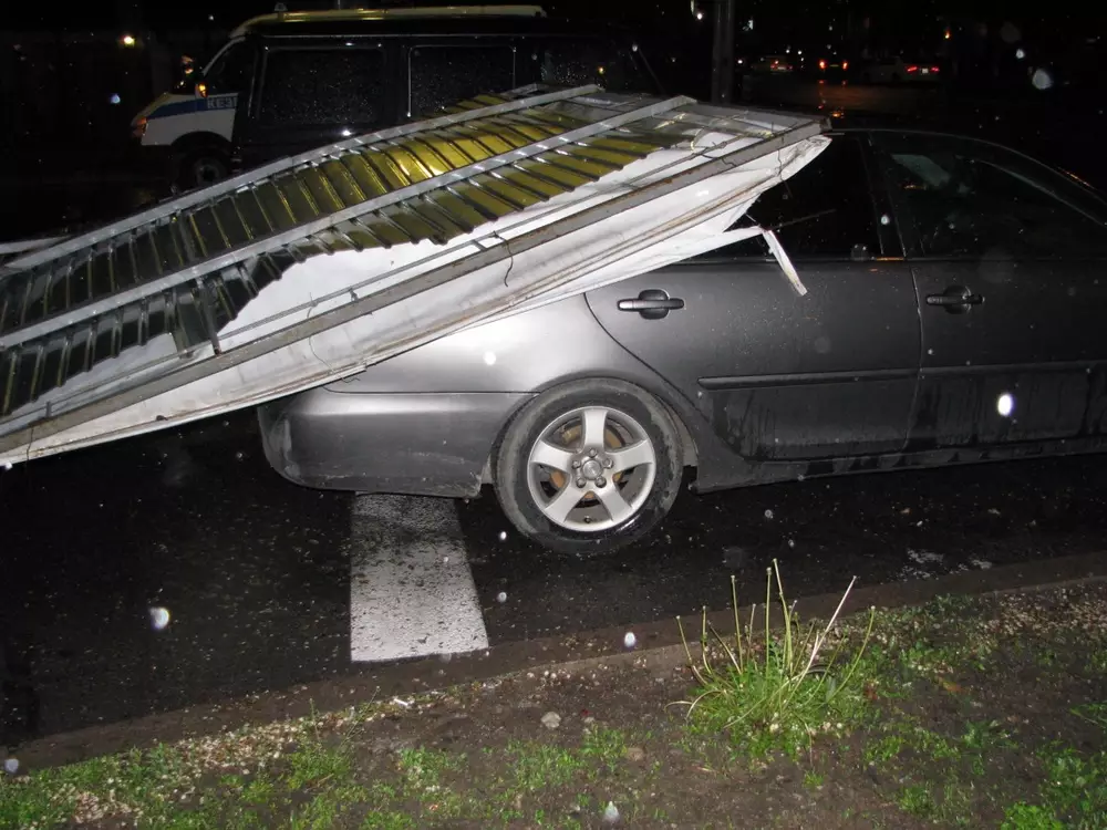 Большая металлическая конструкция упала на автомобиль марки "Тойота Камри". Деформировав крышу авто, щит остановился над головой водителя.