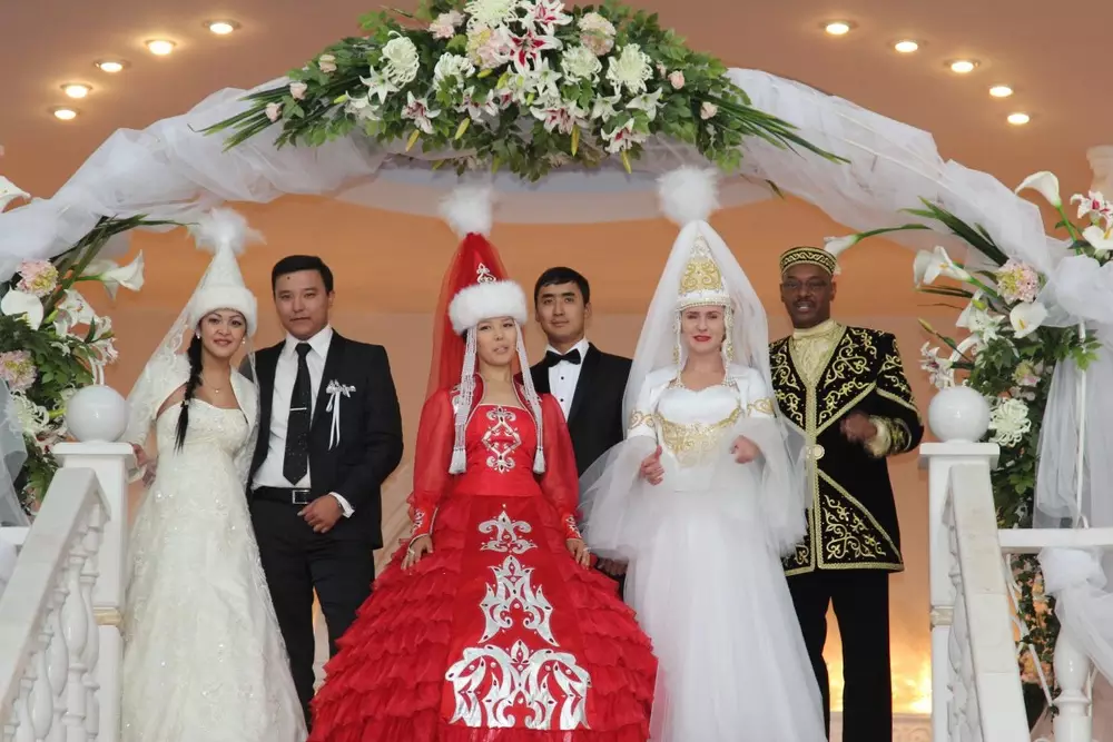 Самой запоминающейся парой на параде стали Светлана и Джеймс Джубили. "Мы решили жениться в национальном костюме... Это была моя идея. Я это предложила, поскольку являюсь гражданкой Казахстана, а мой будущий муж согласился... Я считаю, что казахские национальные свадебные платья очень красивые и мужской костюм очень нарядный", - рассказывает невеста.