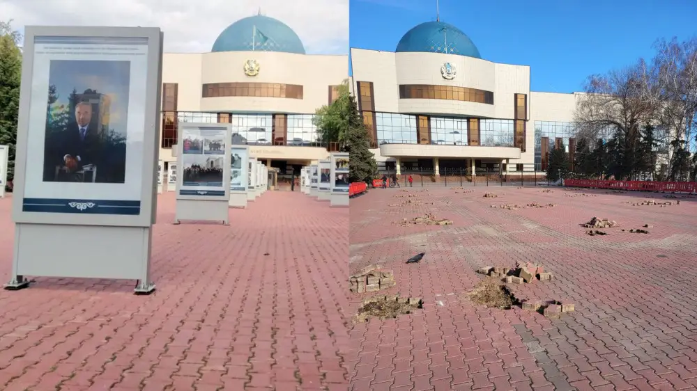 Раньше на этом месте стояли стенды с архивными кадрами экс-президента, сделанными в разные годы, в том числе с участием других политиков. Накануне читатель Tengrinews.kz заметил, что фото исчезли из сквера.