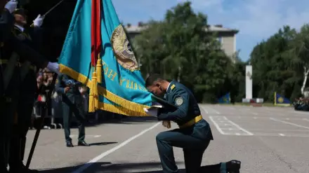По сложившейся традиции мероприятие завершилось прощанием с боевым знаменем и парадным маршем выпускников с исполнением гимна Пограничной академии КНБ.