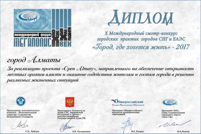 Проект Open Almaty, направленный на обеспечение открытости местных органов власти и оказание содействия жителям и гостям города в решении различных жизненных ситуаций, удостоен диплома победителя X Международного смотра-конкурса городских практик городов СНГ и ЕАЭС "Город, где хочется жить - 2017", передает корреспондент Tengrinews.kz.