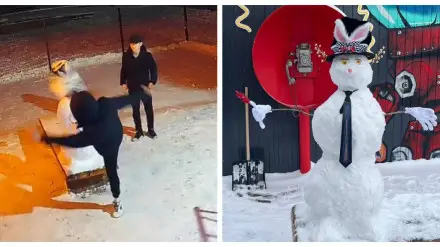Молодые люди зашли на территорию аттракциона, подошли к рекламному стенду и начали пинать его. Затем они направились к снеговику, который был установлен рядом. Один из них ударил снеговика ногой по голове и снес её, после чего оба сразу убежали.