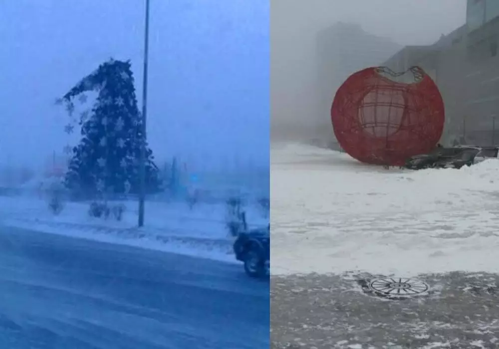 Из-за сильного бурана в Астане 29 декабря этого года новогодняя инсталляция возле торгово-развлекательного центра "Керуен" повредила авто. Также из-за непогоды пострадала новогодняя елка возле торгового дома "Рахмет".