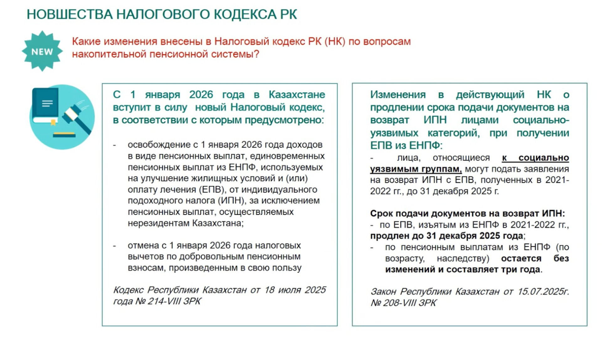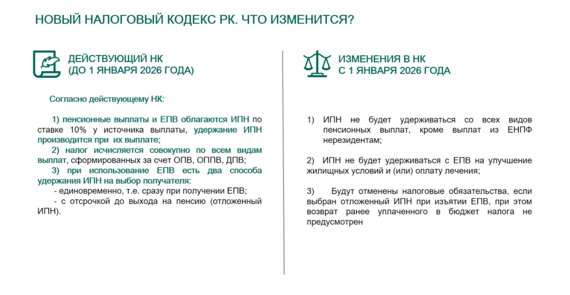 "С 1 января 2026 года вступят новые нормы Налогового кодекса, которые освобождают от уплаты (ИПН - прим.), за исключением нерезидентов. Кроме того, ИПН не будет удерживаться с единовременных пенсионных выплат на улучшение жилищных условий либо на оплату лечения", - заявила Темербекова.