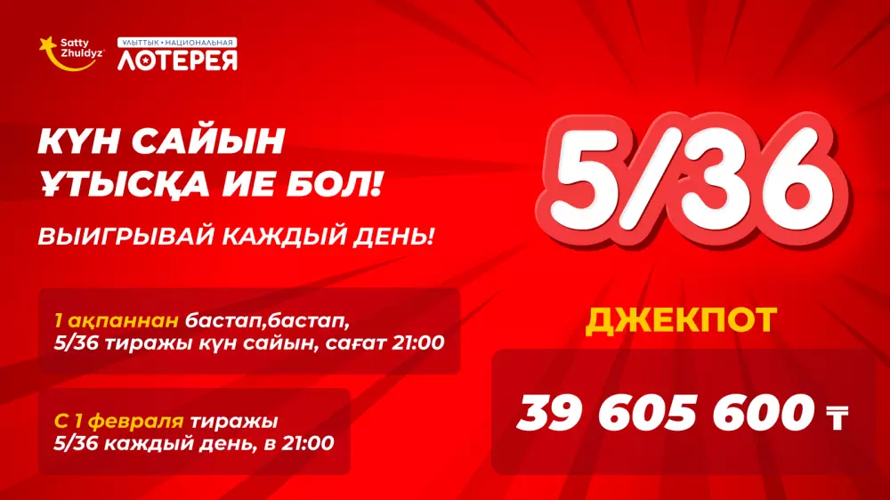 Следующий тираж состоится 31 января в 22:00 в прямом эфире YouTube-канала Satty Zhuldyz. Отметим, что с 1 февраля тиражы 5/36 будут проводиться каждый день в 21:00.