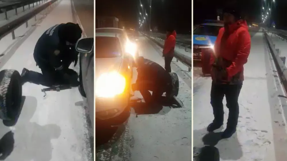 Женщина с грудным ребенком в салоне почти на час застряла в мороз на загородной трассе Семея: спустило колесо. Выручили проезжавшие мимо сотрудники полиции.
