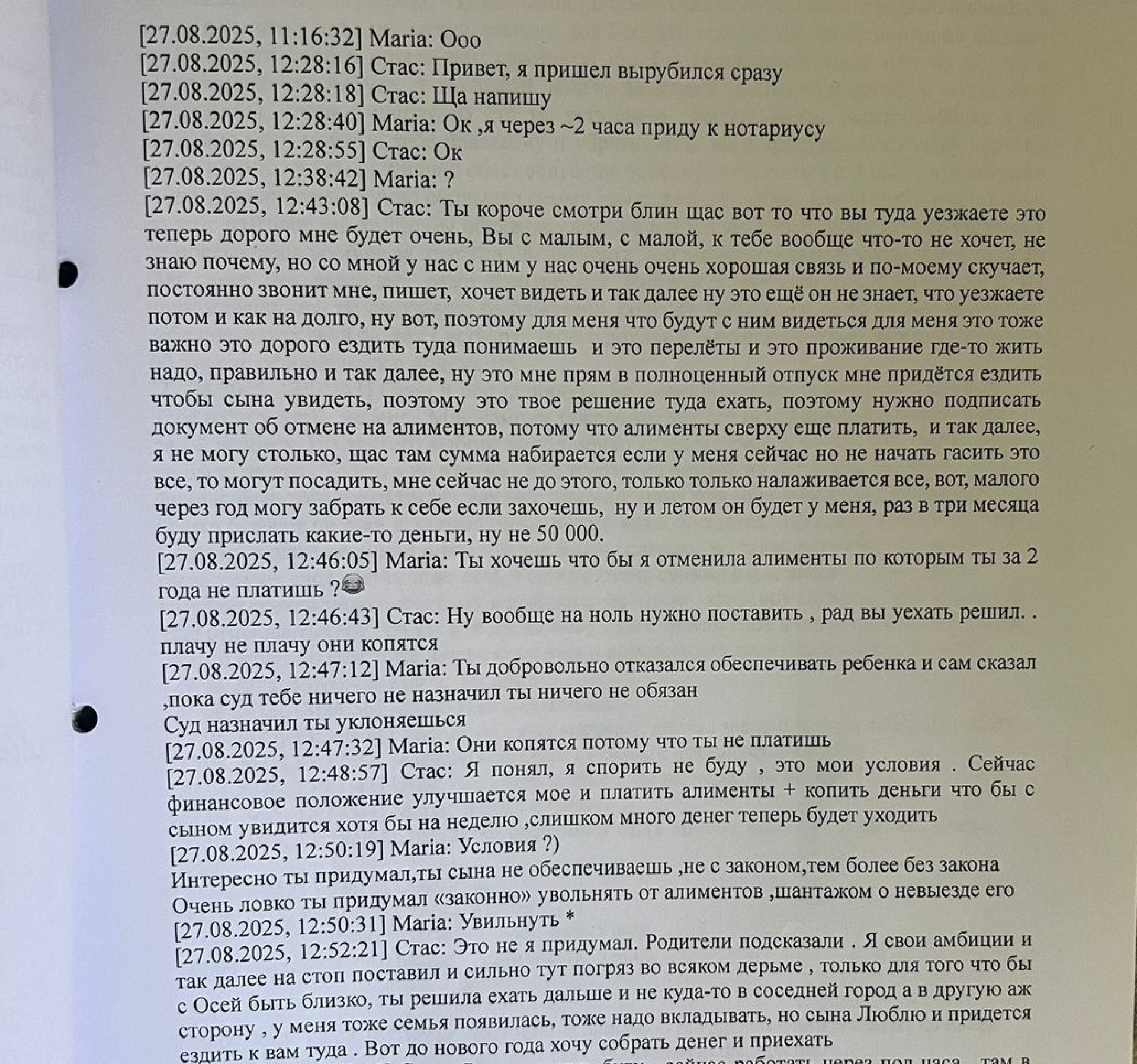 "Меня откровенно шантажируют моим собственным ребёнком. Я должна срочно выехать в Россию с младшим восьмимесячным ребёнком на лечение. Однако отец моего трёхлетнего сына, зная об этом, пошёл на преступление: совместно со своими родителями отказывается возвращать его, пока я не откажусь от алиментов. Меня ставят перед выбором - либо я получаю обратно своего ребёнка, либо отказываюсь от законных алиментов. У меня есть нотариально заверенные переписки, где прямо сказано: "Откажись от алиментов - получишь согласие". Это не просто моральное давление. Это - шантаж, торговля ребёнком, прямое нарушение закона. Также он клевещет на моего супруга, хотя муж обеспечивает нас и выполняет отцовские обязанности по отношению к обоим детям. А бывшему супругу ребёнок не нужен - все годы в разводе живёт через дорогу, а встречи с ребёнком можно посчитать по пальцам", - рассказала собеседница издания.